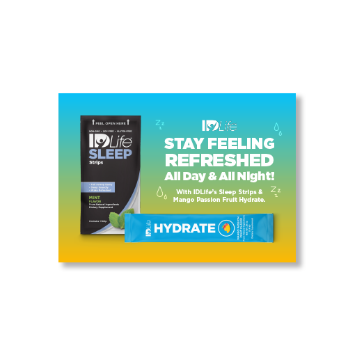 When you purchase this special promotional Hydrate pack, you’ll receive 5 trial cards with one IDLife Hydrate stick in Grape flavor and one IDLife Sleep Strip attached to each one.